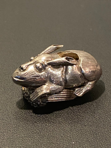 This delightful miniature silver animal is beautifully modelled with expressive facial features, finely chased fur detail, and a textured ear of corn held between the rabbit’s paws. The body is hollow-formed with hand-worked surface engraving typical of continental novelty silver miniatures.