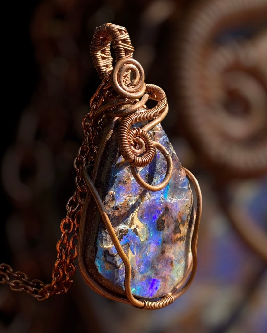 This one-of-a-kind opal pendant is a collaboration with TFD Jewellery who did the lapidary work on the opal and my sister from Connie’s Crystals who lovingly wire wrapped this beauty using high polish copper.