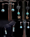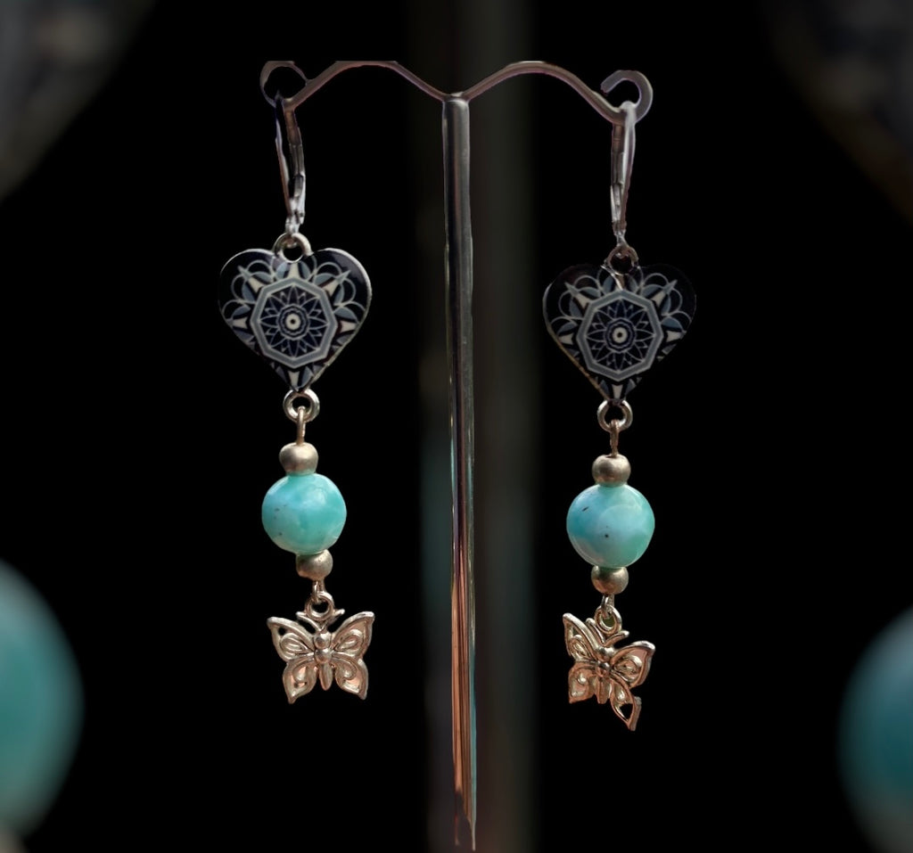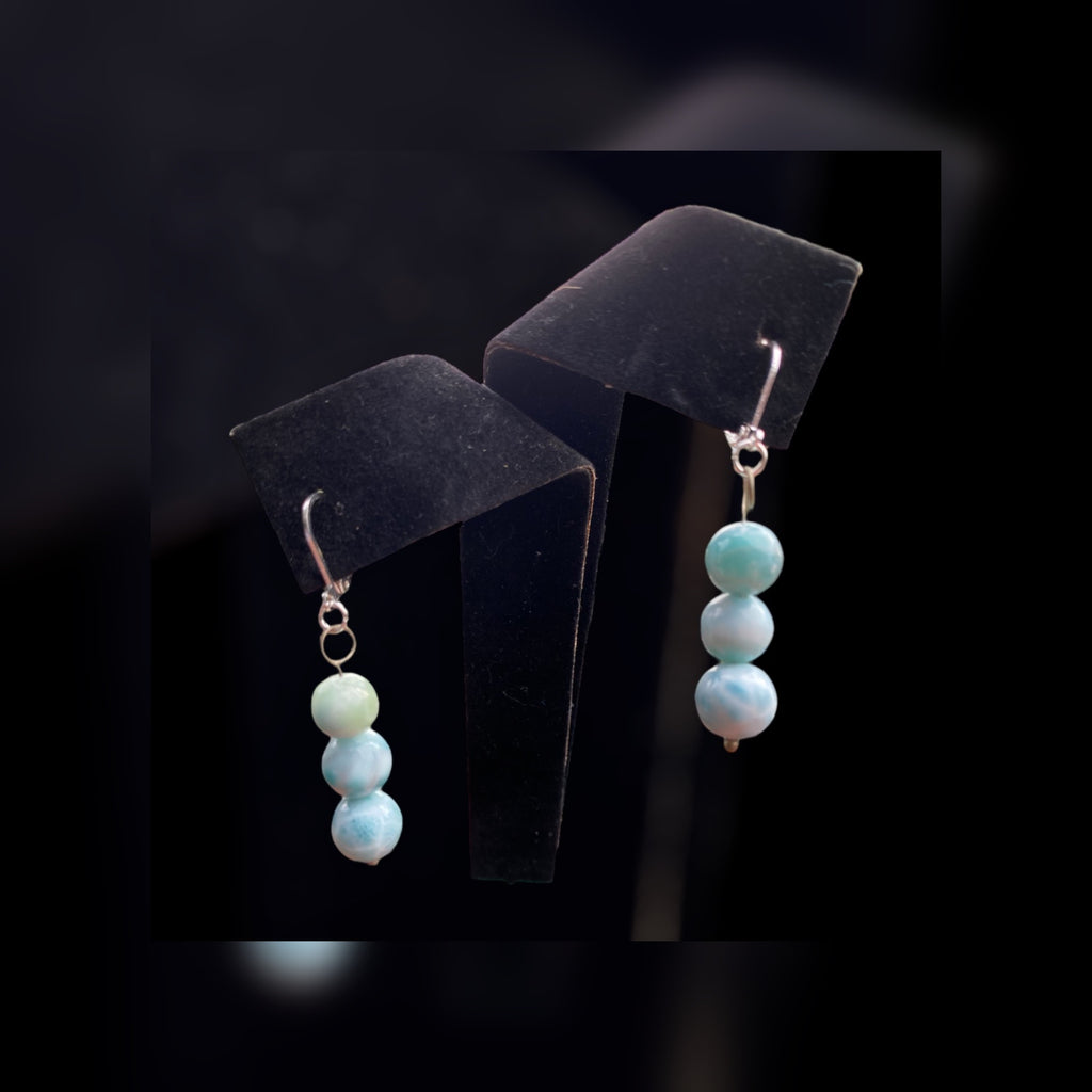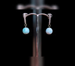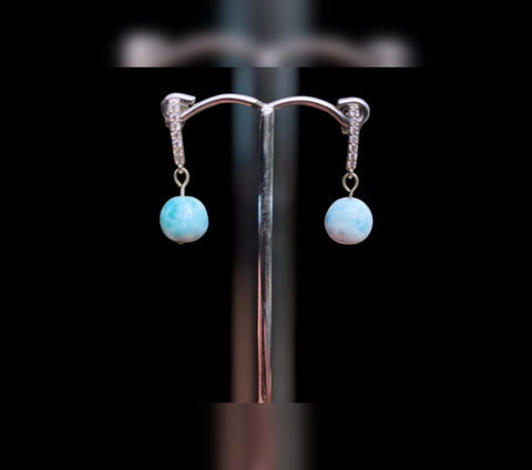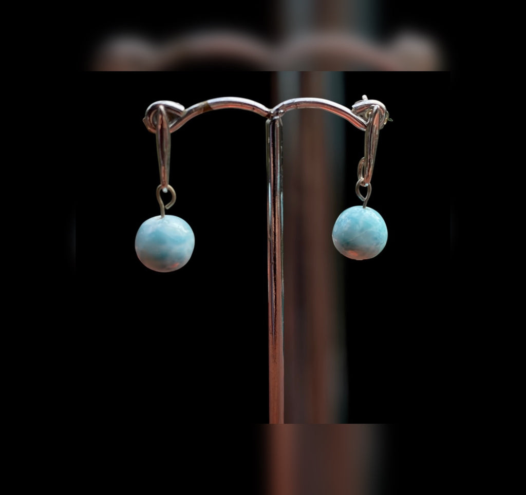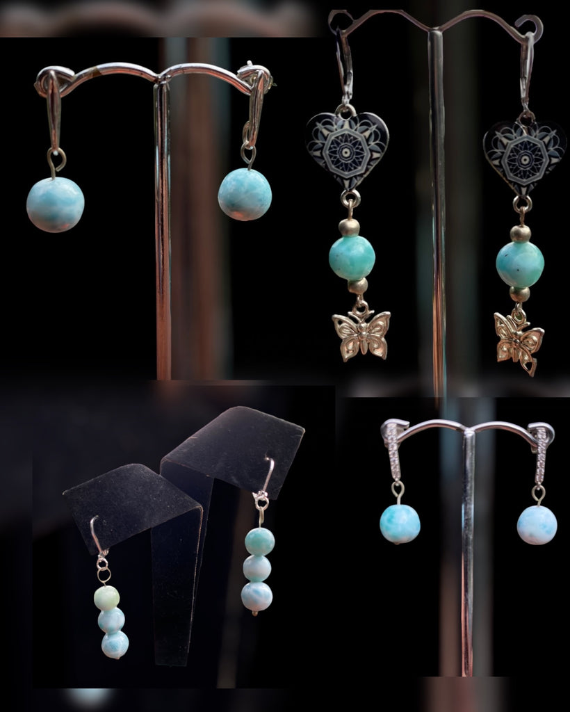 These beautiful natural ocean blue mini sphere shaped Larimar Pectolites are handcrafted with sterling silver findings into earrings. We have 4 varieties- 3 sphere drop; diamanté stud; silver stud and heart & butterfly drops. Use the drop down box for your selection.