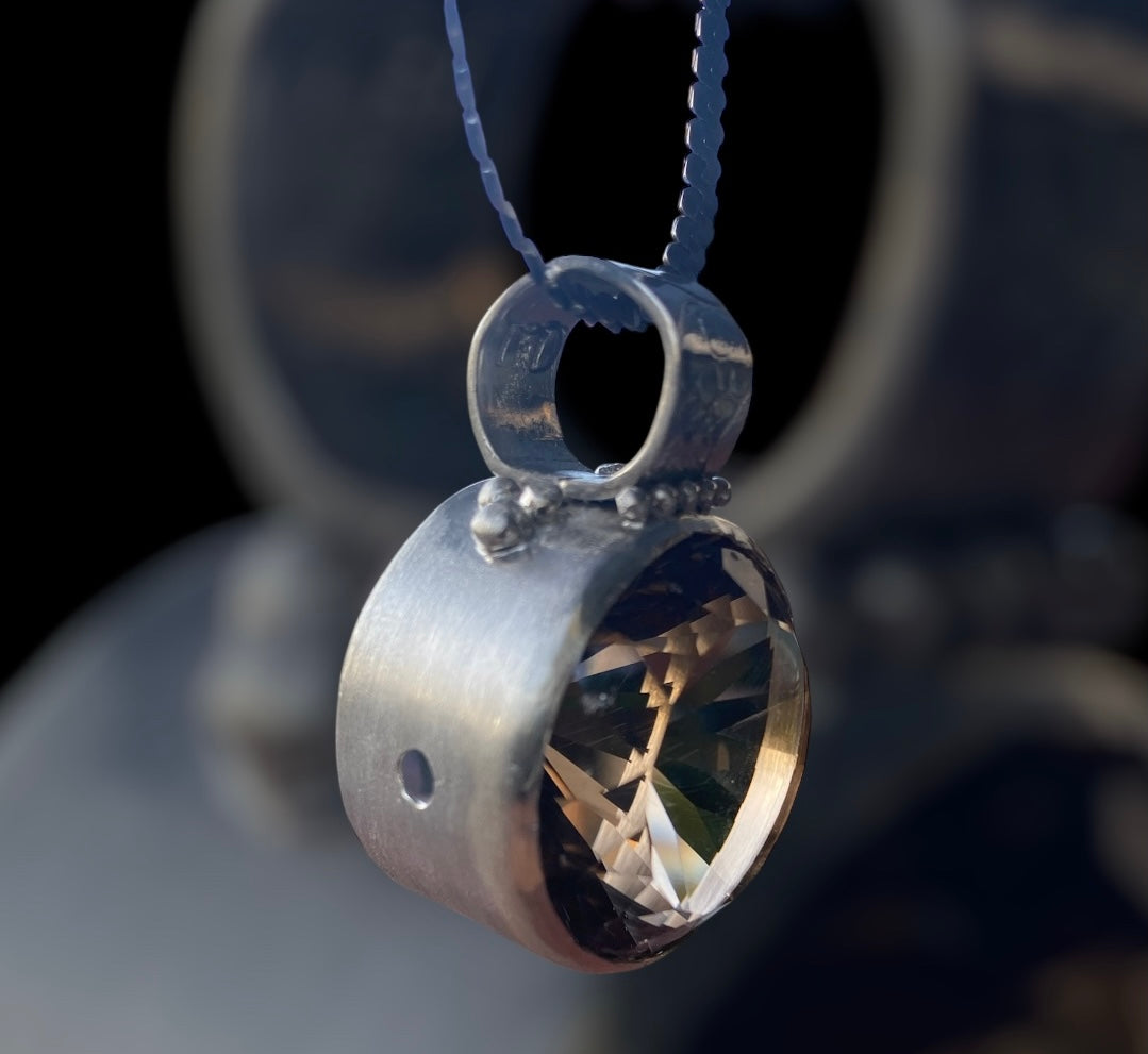 A breathtaking 97.65 carat Smoky Quartz radiates deep champagne and espresso tones, set in a handcrafted sterling silver bezel with a refined satin finish. Designed as a true one-of-a-kind statement piece, this pendant captures the beauty of natural stone and artisan craftsmanship in its most striking form.