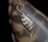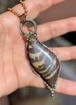 When Wearing Septarian as jewellery, you must keep it close to your body so that you will always be in your septarian’s vibrational fields. So I have made this magnificent piece into a one-of-a-kind pendant creation. The stone is a whopping 82ct from Madagascar, AAA quality with an excellent polish and no treatment. The backing plate is textured copper, and the bezel and adornments are sterling silver.