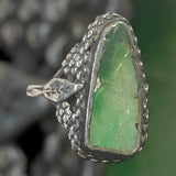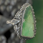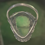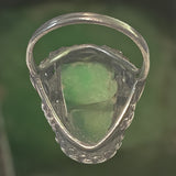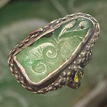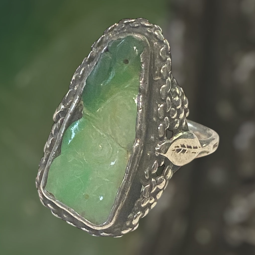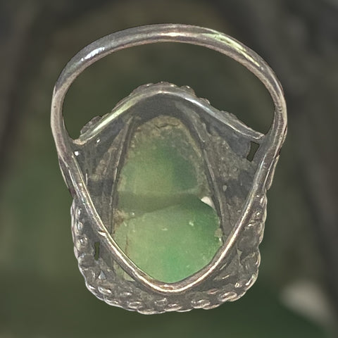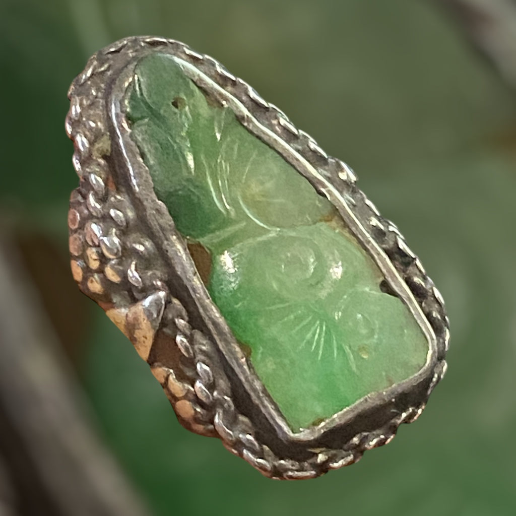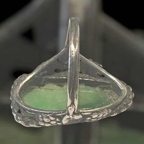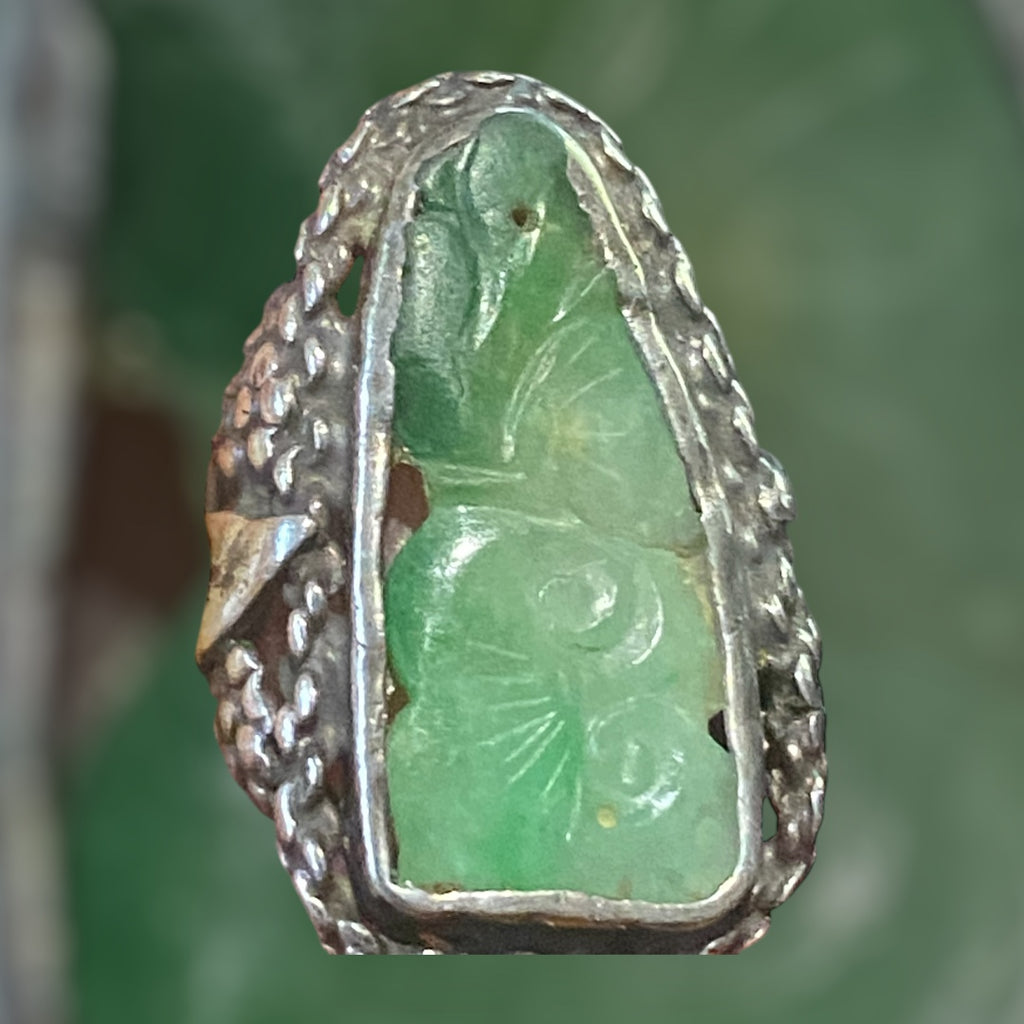 Vintage near antique Chinese Export Silver filigree and green jade stone ring. A lovely piece, likely 1930s to 40s. These pieces are usually sterling, and we estimate this piece to be .900 to .925 silver purity. The stone is a lovely green jade carving that appears to have been repaired (see photos).