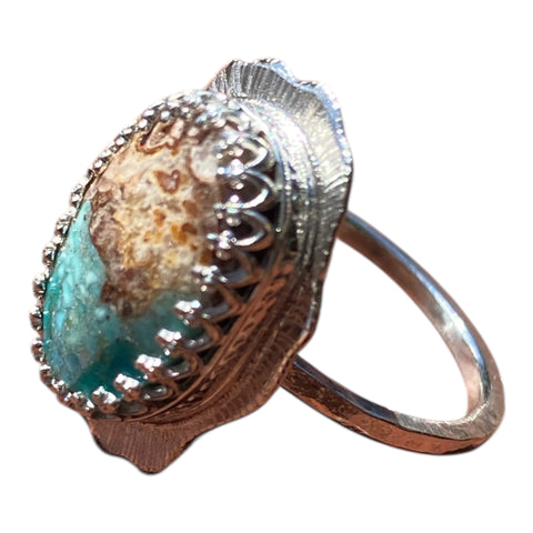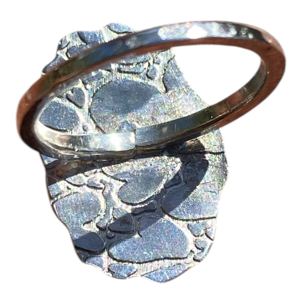 This ring forms part of my Signiture Collection, it has a centrepiece custom Cabochon - 16mm x 12mm Bacon Opal with Turquoise Inlay gemstone. It is set in solid sterling silver with a heart textured back plate and hand engraved edges, with a hammered effect band. Size 6.75 and weighing 4.60grams.