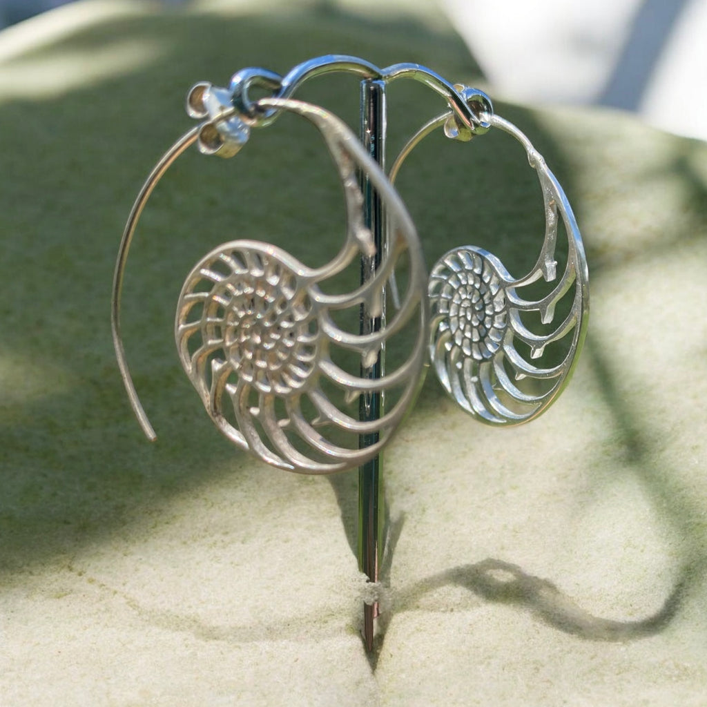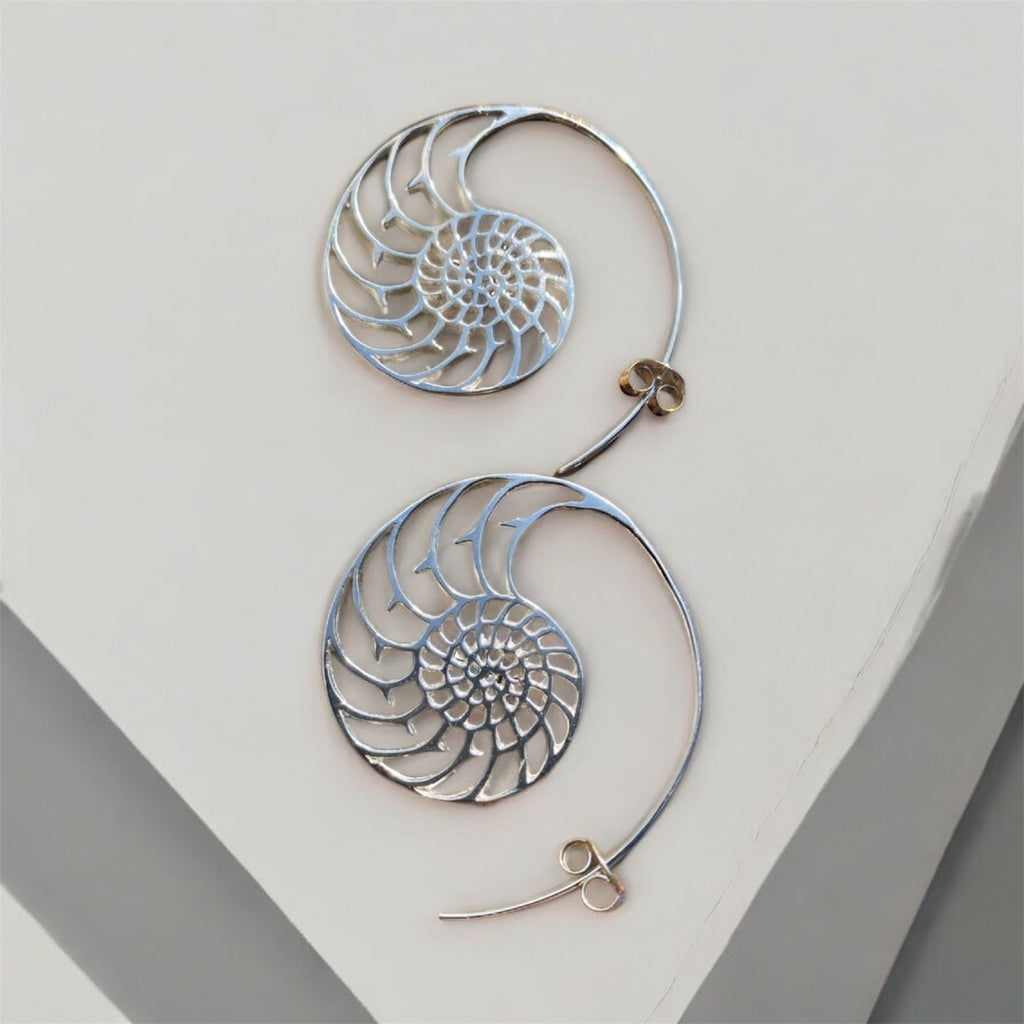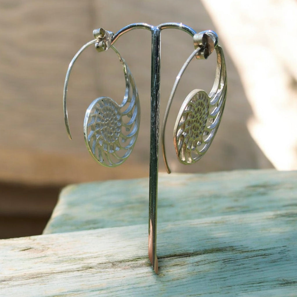Beautiful pair of spiral earrings, in a striking nautilus shell design. Inspired by the sacred geometry of nature, ammonite fossils, seashell spirals, and the precise mathematical patterns and harmony apparent in the natural world, relaxing into the order of the universe. These earrings have a wonderful boho, geometric, mandala quality to them, and are very comfortable to wear.