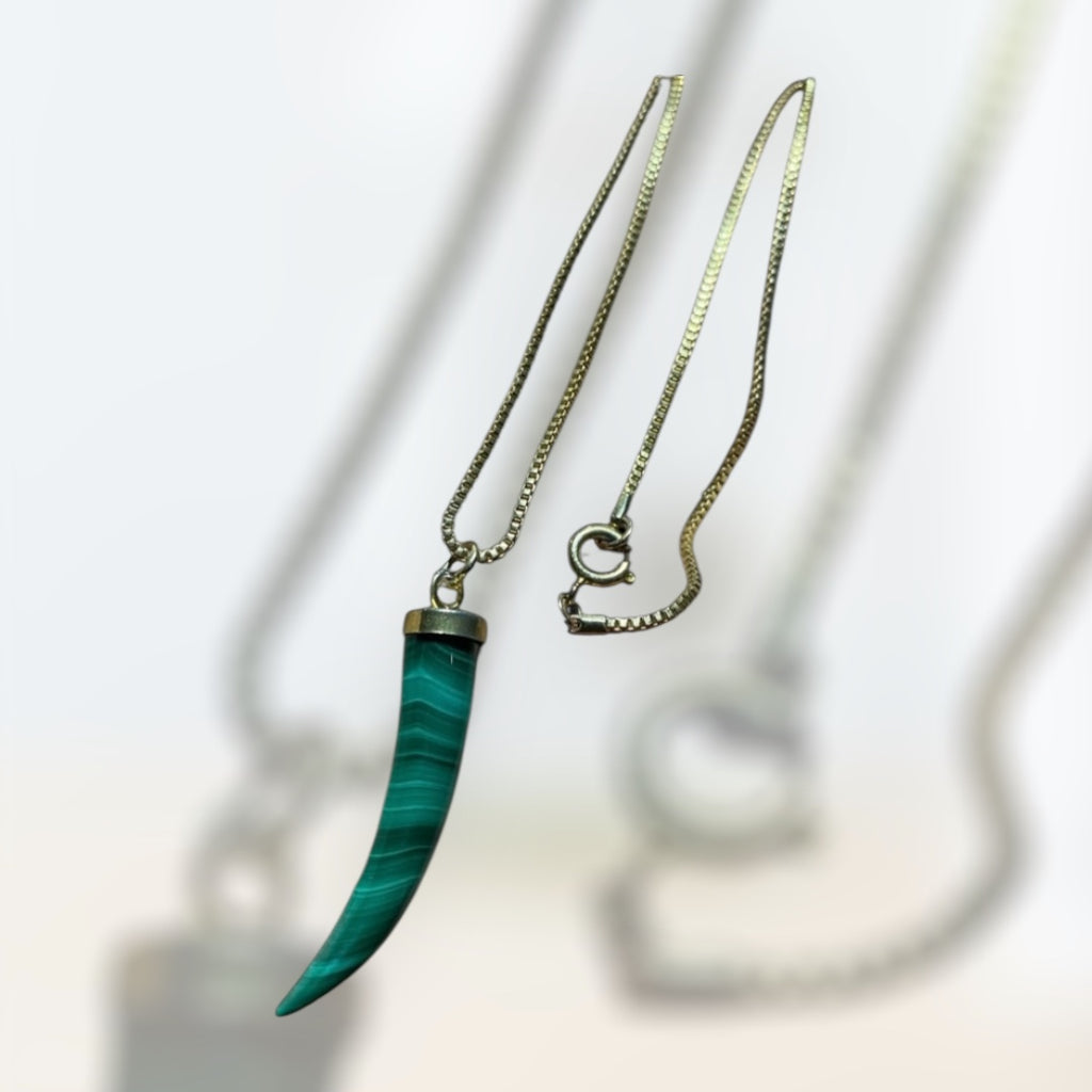 Vintage Gold Plated Malachite Horn Pendant. The Malachite horn measures 40mm long and is suspended on a 45cm box chain gold plate.
