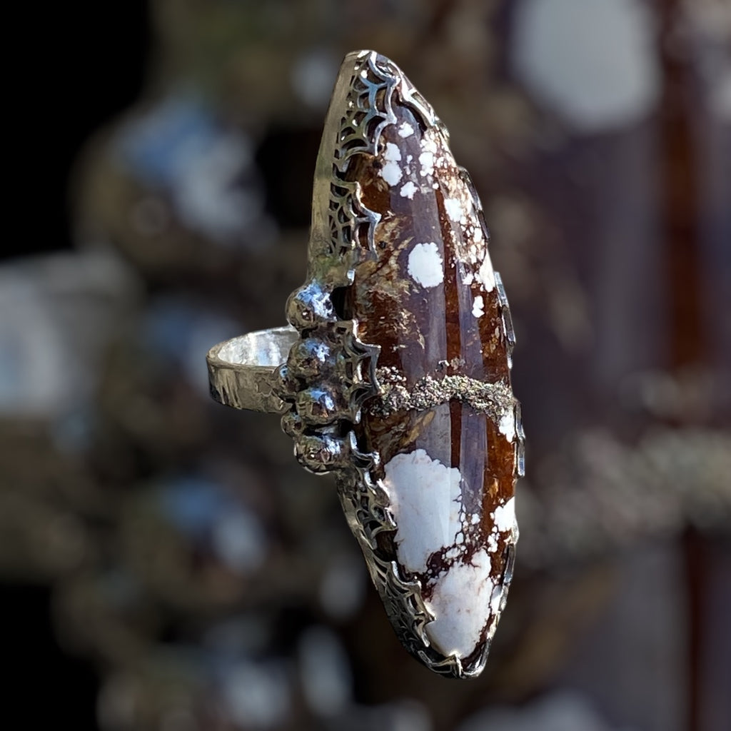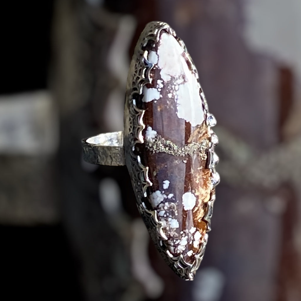 Handmade sterling silver and Wild Horse Magnesite stone ring in a comfortable size 7. The stone is 28ct and measures 45 x 13 x 5 mm, the total weight of the ring is 12.50 grams.