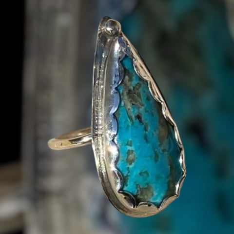 A pretty size 6 Kingman Turquoise Stabilized 25x11x5 mm cabochon ring, handmade in solid sterling silver with a .999 scalloped bezel.