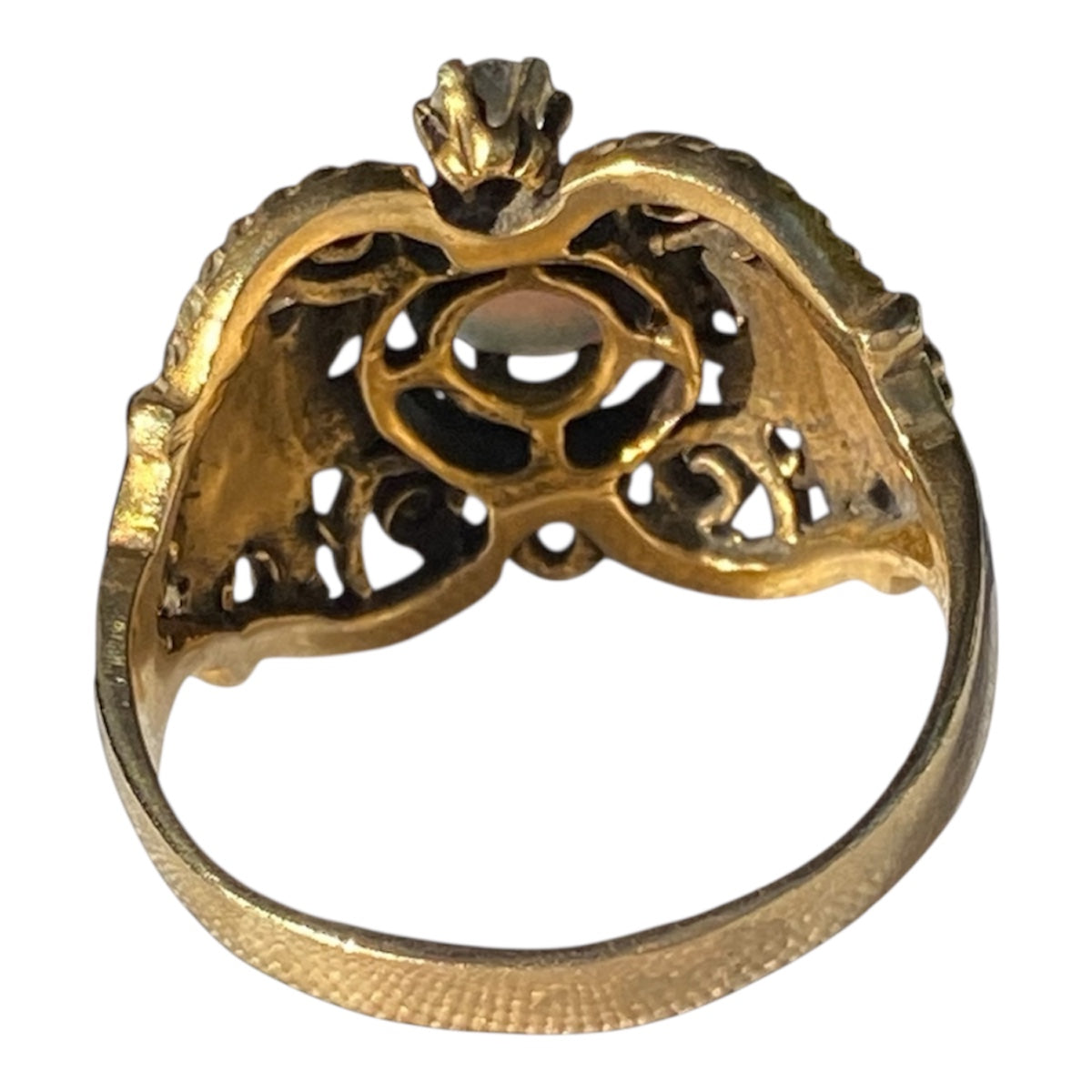 Crafted in solid 14K yellow gold and weighing a substantial 7.30 grams, size 10, the ring features intricate openwork and sculptural detailing true to the Art Deco period — craftsmanship rarely seen in modern production.