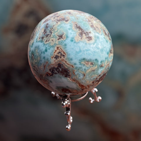 Larimar is the embodiment of the tranquil Sea and Sky energies. Its soft, soothing blues and calming turquoise are streaked with white patterns that resemble sunlight dancing beneath Caribbean waters. It brings the ancient wisdom of Atlantis and the healing power of dolphins to harmonize the body and soul.