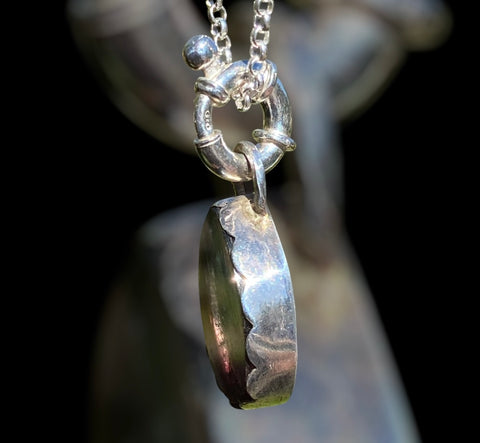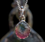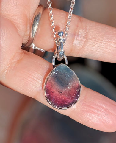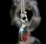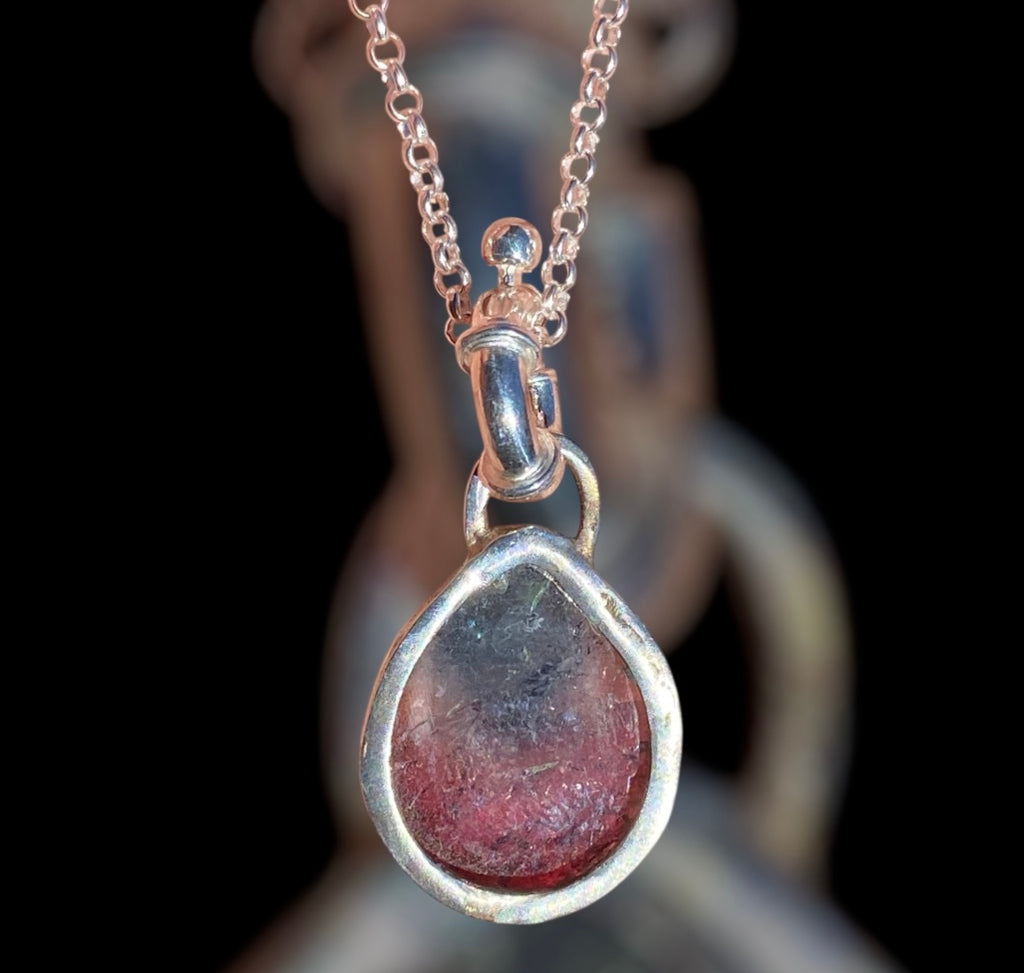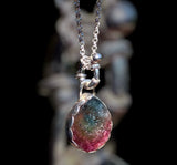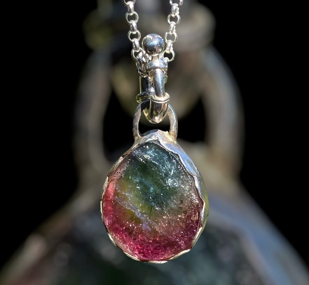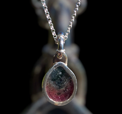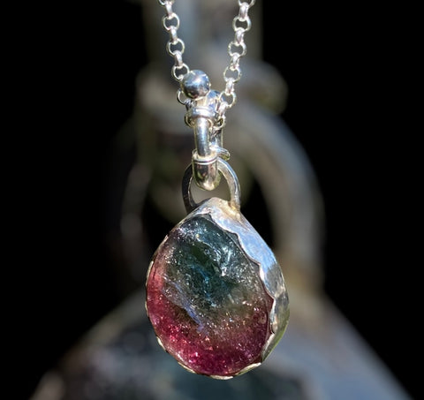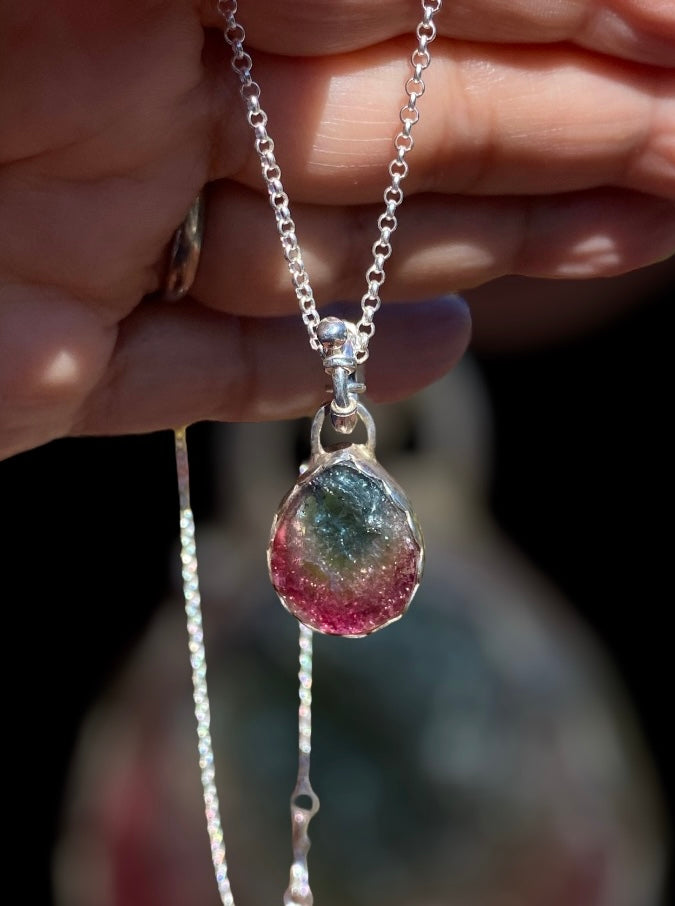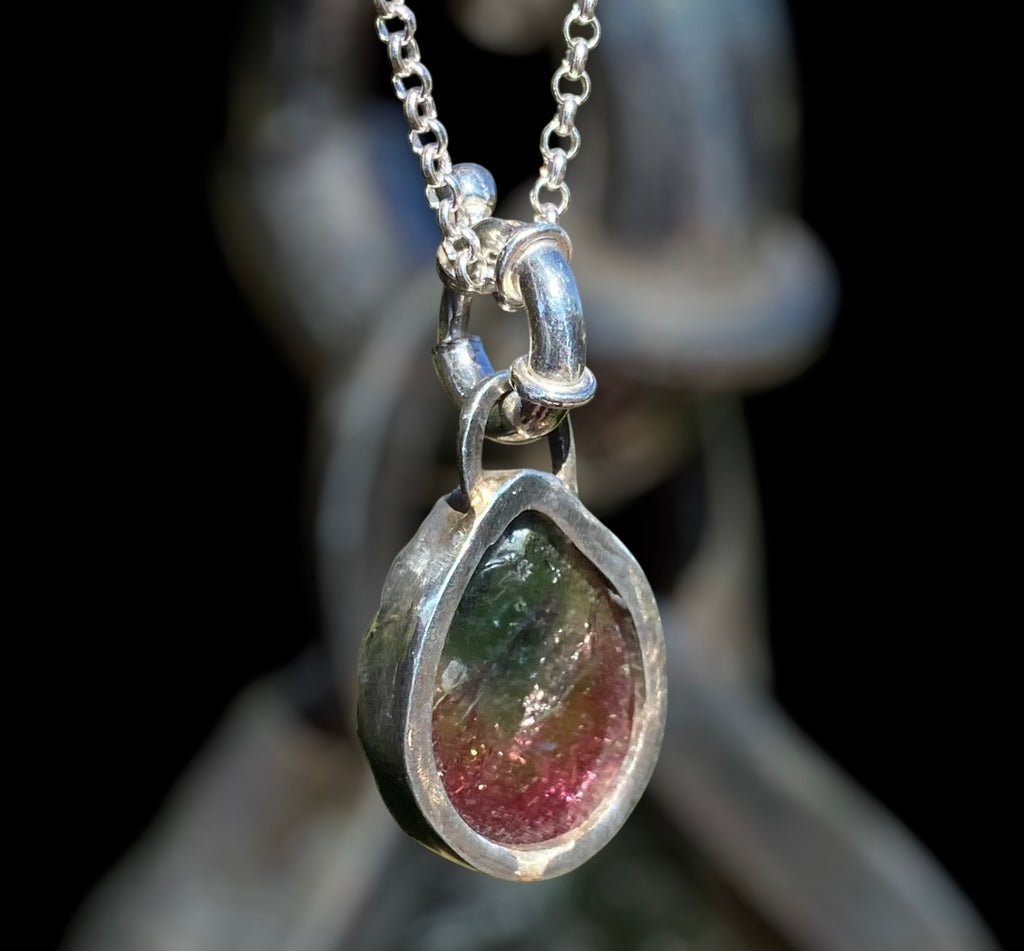 Handcrafted sterling silver watermelon tourmaline pendant with a 45cm Rolo sterling silver chain. The tourmaline measures 20mm x 15mm x 5mm.