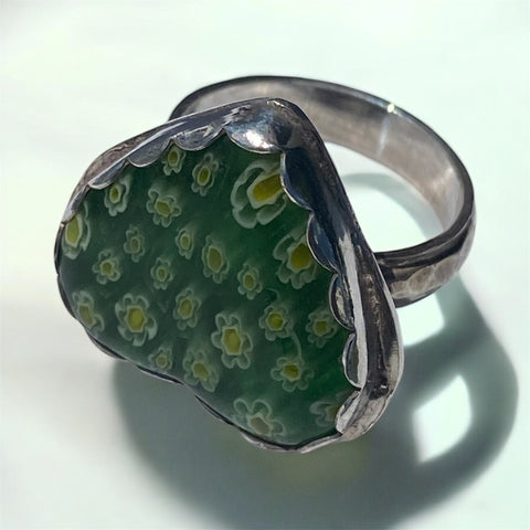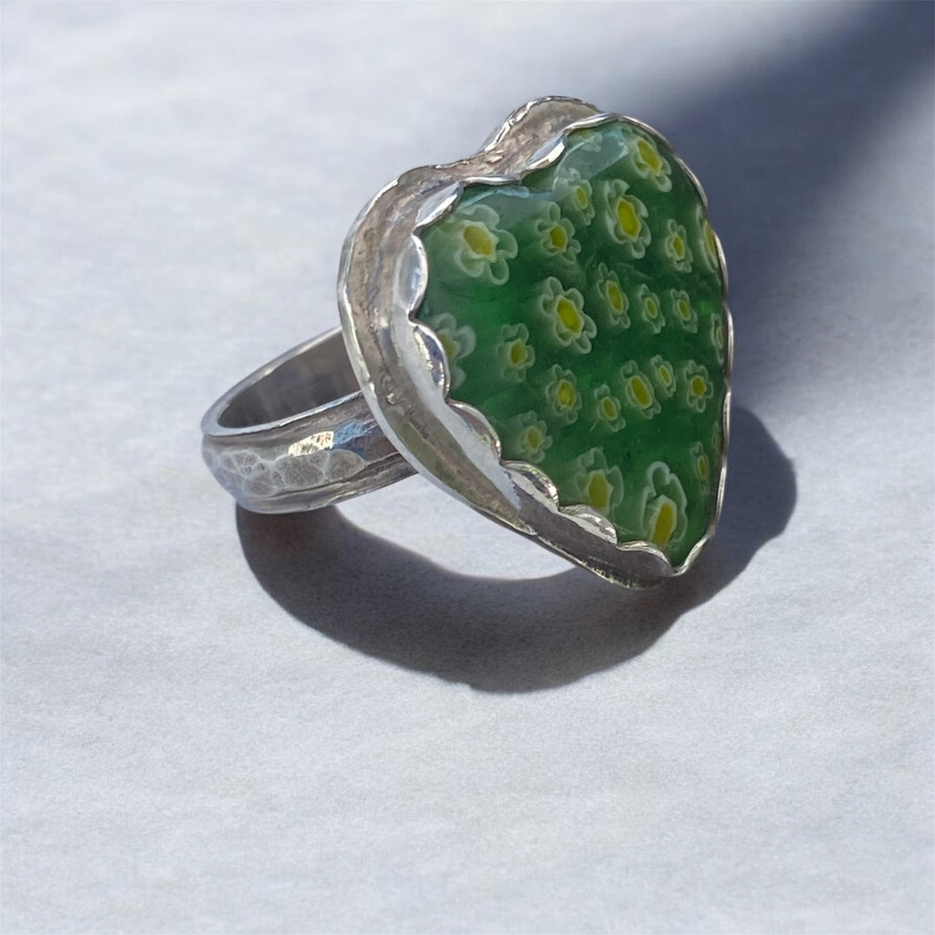 Millefiori Glass, 10.25ct translucent multicolored 12mm flat Heart predominately lime green set in solid sterling silver. I floral textured the backplate and the band is hammer textured. I set the heart with a .999 scalloped bezel. This Millefiori Green Glass Heart Ring is a comfortable Size 7.5.