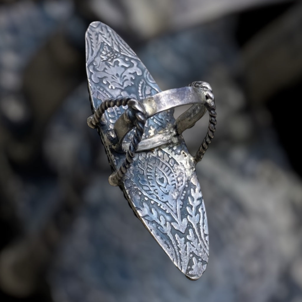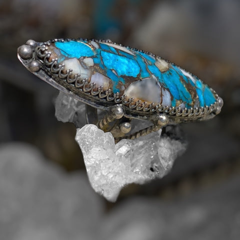 Beautiful 43ct Colbaugh Composite Kingman Turquoise & Pink Opal cabochon set in sterling silver and fine silver gallery wire bezel. The ring is adorned with 14 silver droplets and a triple sideband. The cabochon is marquise cut and a whopping 53 x 15mm in size. The base plate is textured and the ring is a size 7.5-8.