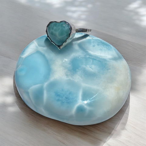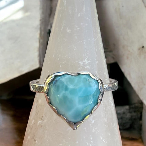 Handcrafted artisan heart ring set with a gorgeous 6.8ct Heart Shaped Ocean Blue Larimar sustainably sourced from the Dominican Republic. I set it in a scalloped bezel with a solid sterling silver textured thin band, that is 1.5mm wide, and in a Size 8.